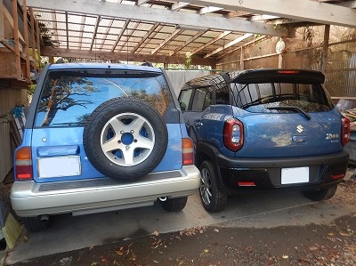霙が帰省してきたときの車庫の風景を見ると、1200ccのコンパクトクラスとは思えないほど存在感があります。BLUEらすかるΩもノーマル規格ですから、後方投影面積として見たときのクロスビーはなかなかのでっちりです。しかも室内で比べたらエスクードよりも広い。安全と快適装備に関しては、90年代の四駆は勝るところが一つもない(笑) それにしてもクロスビーのテールランプのでかさは半端じゃないです。
