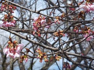で、上の写真でお分かりかと思いますが一昨日上がってみたらもう開花していました。さすがの河津桜。この連休初日あたりに開いたような感じで、その他のつぼみも続々と大きくなっています。連休明けからいくらか雨降りらしいので、その後の寒の戻り次第でしょうけど見ごろは今週末かも。