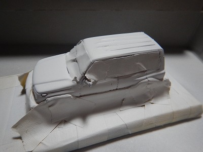 前回の記事でお気づきの方は、ごまかしの利かない良い目をお持ちです。前回の時点でなにげにルーフエンドスポイラーがついております。このパーツは、同スケールで某ポルシェの型式を覚えられなかったオープンカーから剥ぎ取りました。パーツ代として換算すると3500円です。1/43というスケールでの流用はなかなかコスト高になります。このあとTD11Wには付いていないルーフレールも調達しなくてはなりませんし、うちのTD61Wに付いているフロントガードやらスペアタイヤのスコップやら、最大難度と思っているエアロバグガードとこのスケールでのラジエターグリルもどうにかしなくてはいけないのです。タイヤとホイールの問題もあります。