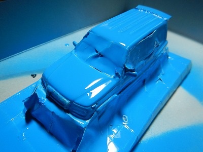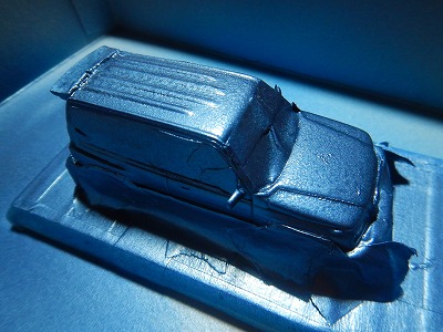 結局、こんなものかなーと思わせる近似色は、メルセデスの特注色にあったライトブルーのメタリックでした。これを見つけるために塗料の通販サイトでカラー名を調べ、その名称とコードで画像検索し、80色ほどを比較しました。あくまでも近似色です。脳内補正かけまくりで無理やり納得するという、俺も年とったなあの心境です。吹き付けた瞬間は銀色が強くでて自分の方が蒼ざめましたが、乾燥させるうちに青味が浮き出てきました。しかし粒子が粗くざらつきます。あとで磨こう。