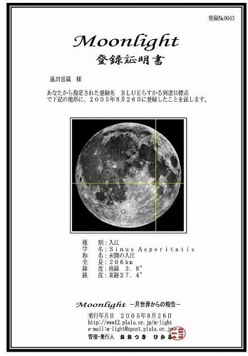この証明書は、今は閉鎖されてしまったみたいですが「moonlight 月世界からの報告」という、月に関する博物学的サイトから頂戴したもので、自己申告によって月面の海やクレーターなど、現実に月着陸された場所や不吉な名称の地点を除き、希望するポイントを記念として認定してもらう面白い趣向でした。