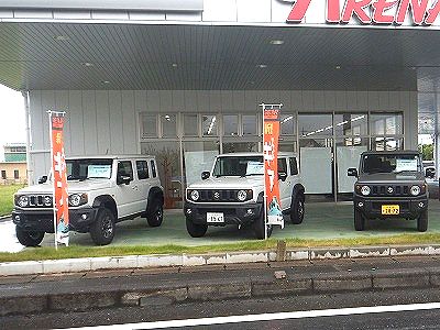 出荷停止中ながらようやっと、ディーラーレベルでもジムニーノマドが店頭に飾られるようになってきまして、JB64、74と並んで見比べ眺められるようになりました。といっても「買う買う詐欺」にすらほど遠い「買わない派」なので、折よく先の信号待ちに並んだ場所から見ていただけのことです。「同じ顔で判別つかない」と雫さんは言いますが、シエラとノマドではラジエーターグリルが黒いかメッキかの違いがあります。実は往時の初代エスクードとノマドよりも見分けやすい。