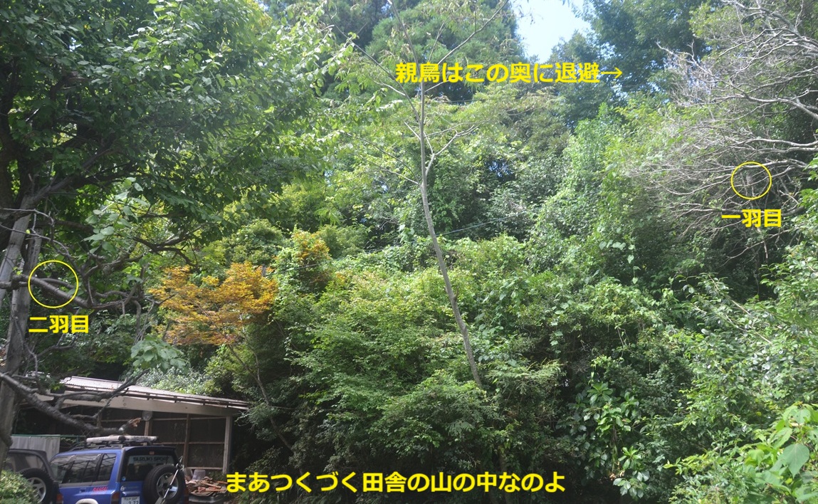それ以来巣立った子供は見かけませんが、親鳥らしき個体の方(左側のぶれてるやつ)は、近づいてくるヒヨドリか何か(右端でブレてるやつ)を追い払うなどしているので、まだ渡りには早いようです。