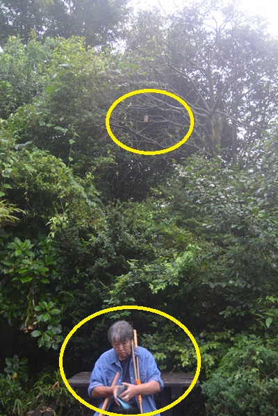 なにしろこのあと小一時間、墓掃除をやって帰ってきてもまだそこにいるくらい、のほほんとしています。アオバズクは聴覚より視覚で周囲の情報を得るので、ヒトの形をまだ覚えきれていないのかも。