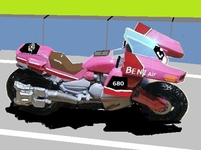 「なんだか髭みたいなウイングつけてるのねアプリリア。そういう空力の考え方が二輪にも浸透してきたけれど、今度のバトルホークなんか結局、エアブレーキはかえってコーナリングバランスに良くないって廃止しちゃいました。新しいのはリサイクル燃料仕様のエンジンと前後駆動用のビスカスとカウルに使ってる再生新素材と再生材ながらグリップと耐摩耗性を向上させたタイヤでしょ。あとはまだ開発途上らしい全個体電池くらいのもので、方便でかばってもらえるなら『マシン自体がリサイクル』。40年近く倉庫で埃かぶってたんだから」