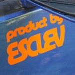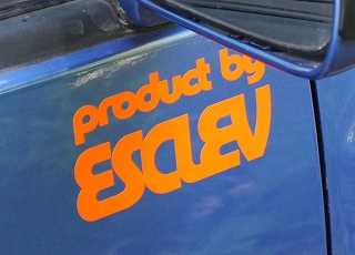 そのデザインをこれまたESCLEV事務局が勝手に(いや、ひと話はしたそうですが)興し直して、いーむらーとさんにて切り出してもらったものをさらに横取りしてきたのが、巷にちらほらと出回り始めたこれです。なんか、うちのクルマだと浮いてるような気がする。幌車の車体色とは合っていたけど・・・