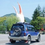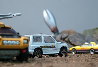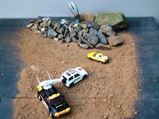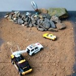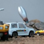 ミニカーのサイズは遠近法の効果を出すためのもので、全部ばらばらのスケール。岩石は庭に転がっている石を拾ってきて適当に積み上げ、大地の土も庭の土手から削り取ってきたもの。ホリゾントはスチロールの様なボードを、これまた庭に転がっているビール籠に立てかけているだけです。