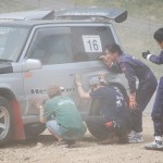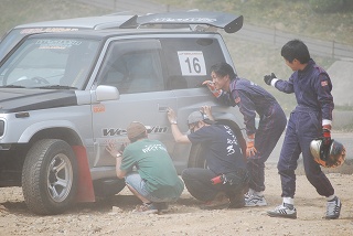 というような対話がなされていたかどうかは定かではありませんが、実際には向こう側のタイトコーナーを怒濤のコーナリングで抜けていく、他車の土埃から身を護っております。このときチームパドックに集結していたつくばーどの面々は、川添・後藤両名の応援をするどころか、