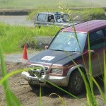 さて耐久の流れはそれでも続きます。川添・後藤組のパジェロミニは、今回はエントリー数の多さからカテゴリー分けされ、午後からの改造車クラスへの出走となっていました。仲間の雪辱は我々が果たす! WESTWINのトップ2の熱い走りは、しかしながらコース上のステアケースの段差など中、大型車に有利な設定に加えて、それらの相手がすべて改造車であるという不利な状況を強いられたようです。無念にも上位に食い込むことはかないませんでしたが、彼らは早くも来月のJXCDに備えて切り替えに入っているそうです。