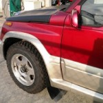 彼のエスクードのどのパーツがどこから取り寄せられたか、もうほとんど失念しましたが、このスタイルは、やはり古参のエスクード乗りがコーディネートしていた手法を取り入れていて、ワイド化されたフェンダーにも白いアルミホイールにも、左右非対称の屋根上装備にも、ひとつひとつ意味があるのです。その延長線で言えば、51/61用グリルとフロントエクステンションバーは、当時なら、たけさんのTD51Wヘリーハンセンに行き着くものであり、同時に今ならBLUEらすかるのトレードマークでもあります。