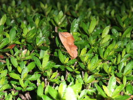 このままでは会社の前の植え込みが枯れてしまいそうなので、2日に一度は水撒きしないと・・・ で、昨日水撒きしてたら飛沫がかかってナニかが跳ねた。見ると、枯れ葉???何で枯れ葉が跳ねるんだ?と、正面(?)見たら厚みがありまして(笑)