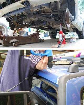今回はコイルスプリングの交換と、リアスポイラーの取り付けが大きなメニュー。スポイラーは車体側への穴あけ加工が必要なので、一同躊躇・・・することもなく、嬉々としてドリルを突き立てておりました。当日の様子は、こんな感じ