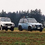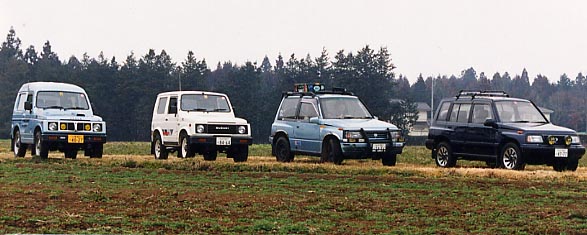 在りし日の我が家のクルマたち(JA51Wは妹・吹雪の亭主、隕鉄くんの所有)。FB13のサニーは留守番になっています。いやもちろんこの頃はまだ、つくばーどを名乗ってはいないのだけれど、ここに風花さん(ゴールドウインのノマド)や物書きの師匠(ゴールドウインの1型)やいーむらーとのはるちゃん(とりあえずジムニーエイト)を呼んでいたら、けっこう見応えがあったのかもしれません。