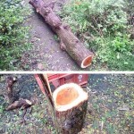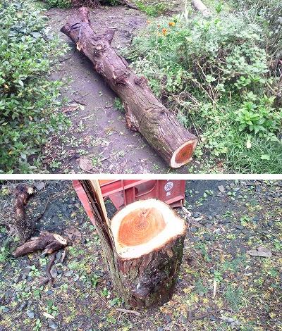 伐採したヒバの木は枝払いをした後、裏の畑の畦道において土手の崩れかかった部分を補強するため、輪切りにはされずにそのまま資材として搬出することになりました。やれやれ、薪割りはしなくていいことになったけれど、枝を払ってみれば5mなんて嘘っぱちでせいぜい2mちょっとの幹が、いやになるほど重いのです。これを斜面から引っ張りあげて、それ引けやれ引けの30分。