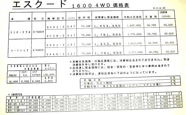 ちょうど20年前のエスクードの価格表を見ると、現在の2.4XGの販売価格がいかに買い得感を持っているかがわかります。それでもテンロクエスクードが売れていたのは、やはりものめずらしかったし、景気もよかったのでしょうけれど、まだ「クルマがほしい」とステータスを求めに行く魅力も高かったということでしょうか。もっとも、エスクードが高かったかというと、当時の他社四駆に比べたら、買い得感は高かったのですが。