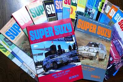 日本ジムニークラブ会報時代のスーパースージーが、どさっと届けられました。今年の春、幻の「日本エスクードクラブ」の足跡を取材するため、二階堂裕さんのオフィスを訪ねて、書棚のバインダーから60冊近くのバックナンバーを借り受けたことがあります。その折、二階堂さんがスズキの社員としてインドネシアに赴任していた約2年間の発行分に抜けがあることがわかって、浜松のクラブ本部から取り寄せることになったのでした。このときのバックナンバーは、当然ながら調べもののあと返却しましたが、何の前触れもなく届いた宅配便にちとびっくり。余剰分を譲っていただけることになったようです。