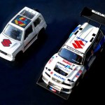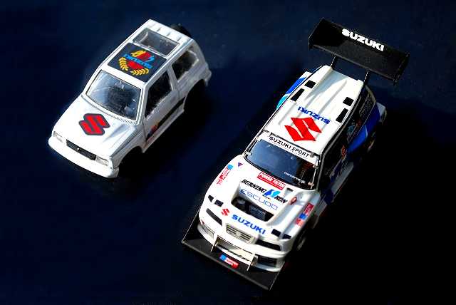 ちょっと仕様の怪しいテンロクハードトップと、グランツーリスモで勇名を馳せる以前のバージョンで組まれた、パイクスピークヒルクライムで知られるモンスターエスクード。奇しくも同一スケールで作られていることから、並べて見比べることができます。ツインエンジンという事実上別物のマシンながら、この時代のモンスターは、オリジナルに極めて近い意匠の再現をやってくれていました。