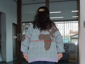 20年近くも前に自分で編んだ〝地球儀〟セーター。タンスから出てきたので久しぶりに袖通してみました。虫にも食われずによくあったこと(笑)
