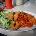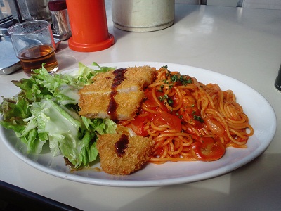 ここへ来る道々、「とんかつにしようか、ナポリタンでもいいか」などと、田舎と言ったら失礼ながら田舎の洋風定食を思い浮かべていたわけですが、どっちも食いたいならこれでどうだと言わんばかりのナポリカツにやられました。これにはメガ版はありませんが、これで充分だよ。