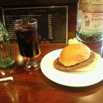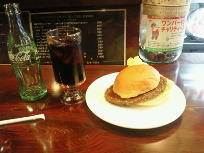 レタスとオニオンスライスを挟んだだけの、ジャンボバーガーは、その名の如くバンズからはみ出しています。しかし注文した後によくメニューを見ると、これが看板の最右翼ではないらしく、上を行ったらステーキサンドというのがあるし、リーズナブルな方にも看板ものというふれこみがあるじゃないですか。しまった、ついビッグマックと拮抗させたのがいけなかった。