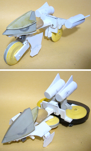 今回、別のロボ造形が完了し、五郎さんのメインの仕事がこの変形するスパーカーに固定されたことから、五郎さんのブログにも専用カテゴリーが立ち上がりました。名付けて「ゴッドスパーカー」。ベタなネーミングですが、それは僕が付けたからで、五郎さんのせいではありません。そしてカテゴリーが立ち上がった時点で、変形シークエンスはすでにCGではなくモックアップの段階にまで進んでいます。どんな仕上がりになっていくかが楽しみです。あっ、でもこのバイクの基本設定を、グランゼルのときのように肉付けしなくちゃいけないんだよ。