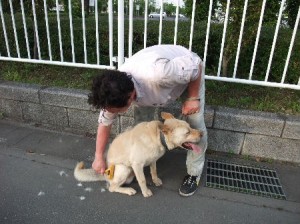 会社の外で一日中人がわさわさ作業してたので、期待して(遊んでもらえるかと)はしゃいでたらしく、夕方になって新月サンが「ぬか喜びさせちゃったみたいから、ゴンちゃん散歩に行ってやろうぜ」と言うので小一時間歩いてきました。