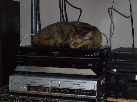 テレビの上というお気に入りの場所が消滅してしまったので、最近開拓したようです・・・