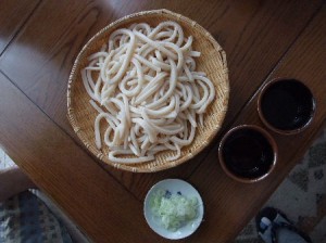 ま、手打ちうどんですが(笑)家にあった薄力粉と強力粉を半々で混ぜてみたんだけど・・・やっぱりちゃんとした中力粉の方が良かったのかな?