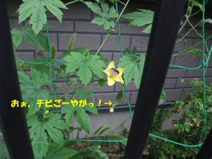 初ゴーヤ、になるといいなぁ。去年はこのサイズのまま枯れもせず腐りもせずずーっとくっ付いてて終わったので。結局一個も口にする事がなかったのよー。