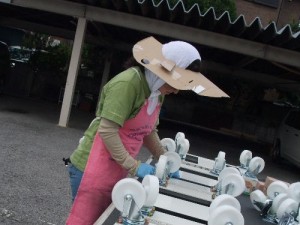 仕方ないからボール紙に穴開けて〝つば〟だけ作って被りましたよ。背中向けて作業してた新月サンが振り返ってふきだしてました。