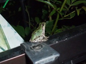 しばらく雨が降らないから水でも撒こうかと思って庭に出たら、フェンスの上にちょこん。
