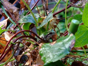玄関横のクレマチスのもっさりの中にちょこんと座ってましたよ。大きさが全然違うので、明らかに別蛙。