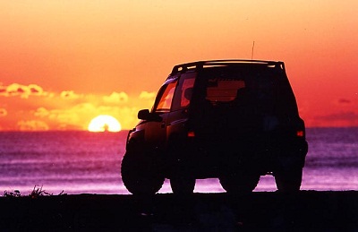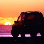 昇る太陽を待ち受けるTA01W。1990年代当時にリリースされていた、イタリア・オートエキスポ製のキャリアとガードを取り付けたシルエットは、ぱっと見たら、うちで乗っていたヘリーハンセン・リミテッドベースの最終形態そのものですが、ヘリーハンセン標準だったキャリアエンドスポイラーが付いていないことで、この個体が別のエスクードであることが識別できます。