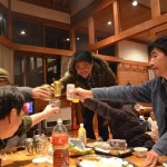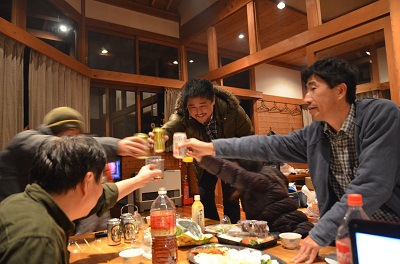 この面々だったら姿を撮しちゃってもいいや。というわけで、忘年会スタートです。雪が降るかなと思われましたが、県北にもかかわらず、パークアルカディアは水戸よりも暖かで、ベランダにて焼き鳥を焼いてます。