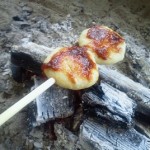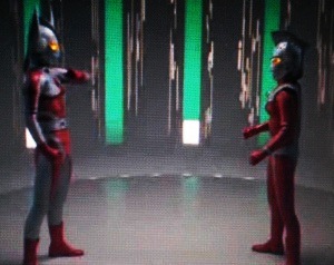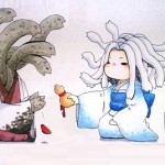 霙が年賀状に描いていたキャラクターが右。これがオリジナルのメデューサなのか、どこかから引用してきたものなのかは定かではありません。実際にはお酌の構図ではなくて、立ち姿でした。そこで、とーちゃんのオリジナルとして、左のヤマタノオロチをコラボレーションしたのが、この絵なのですが、僕はコンテを切って、霙に仕上げてもらいました。
