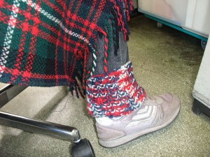 で、以前に母が「足首ウォーマーしてると違うわよ」と言ってたのを思い出して、アクリルタワシ作るのに買っておいた毛糸で作ってみました。適当に編んだら大きかったヨ(汗)デニムの上からで丁度いいくらい。ま、小さくて足が入らないよりはいいかなと。