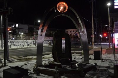 kamaishi釜石駅前ロータリーに据え付けられたモニュメントは、重さ4トンの鉄鉱石とステンレスアーチによって形作られ、かつての釜石製鐵所から移設された高炉の火を灯し続けています。1989年に高炉が休止された折、その火は消されたわけではなく、製鉄所内で維持されてきて、釜石市における近代製鉄発祥の歴史が150年を刻んだといわれる2007年に、このモニュメントにも移植されたのだとか。