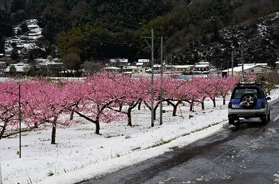 里の桜は終盤に来て突然の雪化粧。彩の強い桃は、より彩りを添えて街道のそこかしこに花を咲かせています。昨年の今頃はあちこちで除染の吹付洗浄が行われていたけれど、いくらかでも改善はなったのでしょうか。