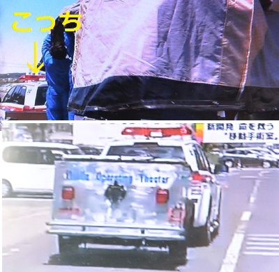 先日の秋田・青森・岩手行脚の往路の朝、「あまちゃん」を見るために(笑)秋田自動車道のPAで車載テレビの受信局を仙台から秋田にチューニングしていたら、いきなり独特のマーキングを施された三代目エスクードが現れたので、あわてて写真に撮ろうとしたけれど、こんなのしか写せませんでした。そのニュースは、エスクードがけん引しているユニットの方で、現地搬送して組立使用する、緊急手術用の移動手術室が開発されたというもの。世の中はドクターヘリが普及しつつありますが、ヘリが着陸できない場所だったらどうなるのか、あるいはヘリの飛べない夜間のコード・ブルーにどう備えるのか、という課題への解決策だそうです。