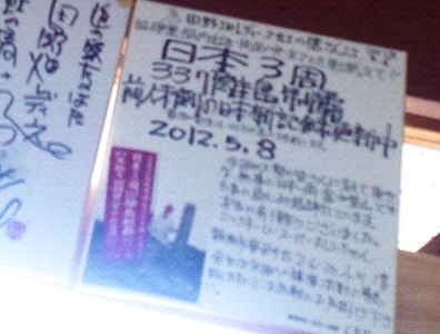 その鴨汁ラーメンはけっこう人気で、昼時にやって来る人々の大半がこれを注文するのだから(たまにビーフカレーの人もいますが)、自分の選択肢もまんざらじゃないよなと思いながら、鴨チャーシューメンを食っていて、壁や軒に掲げられた色紙の中から見つけた一枚。