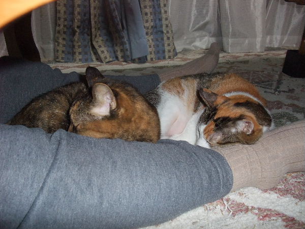 日曜日の午後、お昼寝はじめた新月サンの足の間で寝る二匹。ファンヒーターの前の方が暖かいと思うんだけど?