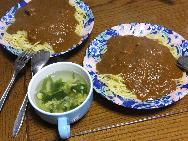 三日カレーライスが続き、四日目の晩はカレーパスタになりました。