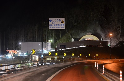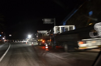 道路は現在大きく右折していますが、何年か後にはトンネルへと直進します。真夜中にもかかわらず、坑内では山の向こう側へと掘削が続けられているのは、それが復興道路だからというわけではありません。トンネルの工事はおおむね24時間体制で行われるそうです。誰もが寝静まっている時刻に、誰かが働いている。それも工事現場に限ったことじゃないのですが、工事現場というのは実に知られざる世界なんだなあと気づかされます。たいていの場合、開通した道路なんて、そういうことを考えることなく便利に走り通過してしまうだけですもん。蛇口をひねると水は出るもの、という感覚以上に、当たり前に便利さを享受してしまってます。