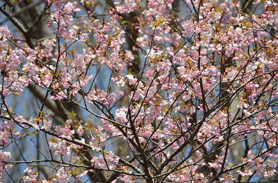 3月16日に撮影した河津桜はすでに満開のピークを過ぎていましたので、天狗の森の南斜面で最も早く咲くこの桜前線迎え桜(非公認名称)は例年通り、10日くらいに開花していたものと思われます。南斜面であるだけでなく、このあたりの標高が大気の逆転層にかかっていることも関係していると想像します。周辺のソメイヨシノも、このあたりだけ蕾がだいぶ膨らんでいます。当然のことですが、山頂に近づくほど、ソメイヨシノの開花は来月まで待たなくてはならない様子です。ことしの水戸周辺の開花予想は4月10日ごろ。ここ数年、入学式の時期には散り始めていたことを考えると、なるほど30年に一度の寒波という異常気象の影響が出ていますね。