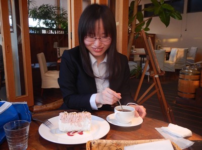 どことは申しませんが、ここのオムライスはなかなかのものです。霰がオーダーしたドリアも「おいしいよー」とのことなので、戦術的には大成功でした。霰は食事のあと抹茶のシフォンケーキを追加したのですが、このケーキもまた、季節ものとして桜風味のトッピングが施されている洒落たシフォンケーキでした。