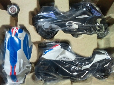 魔進チェイサーのライドチェイサーも仮面ライダーマッハのライドマッハ―も、ホンダNM4っぽいので、それに準拠すると直列2気筒745ccの2個掛け。あれっ? 足しても100馬力ちょっとで意外と平凡なスペック。劇中ではもっとスーパーな動力と性能を有し、300馬力中型のグラビティエンジンを積んだバイクで、四輪化すると二基がけで2000馬力だそうです。計算合わないじゃないか。