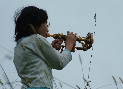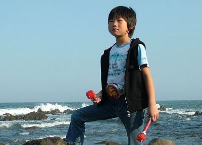 はー、もうそんなになっているのか。なにしろ親世代になって初のライダーがクウガ。まあその頃は「とうとう親子で仮面ライダーを観る時代になったのか」と一喜一憂(ばか)したものですが、探してみたけれど光る回るクウガの変身ベルトを身につけた霰の雄姿の写真はデジタル化されておらず、ここに揚げられませんでした。仕方なく、「響鬼」に登場していた第二の音撃戦士・威吹鬼になりきる十年前の霰です(いちいち出すなよ)