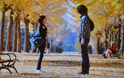 外苑あたりだと奥の方に低い山などは見えるはずが無く、車の往来が写り込みます。このシーンの奥の方には低山と牧草地と、ゲートの門扉が写っているので、たぶん白井農場でしょう。ただ、どうやら今回はアメリカの大学のキャンパスという設定らしいです。