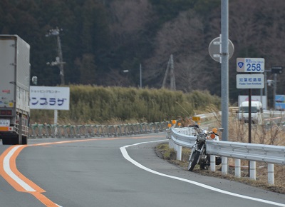 2月28日まではここを通らなくては仙台と関東を行き来できなかった、浜通りの風景。このオートバイがいつからガードレールにつながれたままなのかは不明ですが、昨年9月から全線通行が開放された国道6号にあっても、富岡から南相馬の間では二輪車の通行は現在でも解除されていませんから、ひょっとしたら4年間、このオートバイはここに置き去りにされたままなのかもしれません。こうなっては誰にも回収はできない。それでも乗っていた人が無事に避難できたのならそれでいいのです。