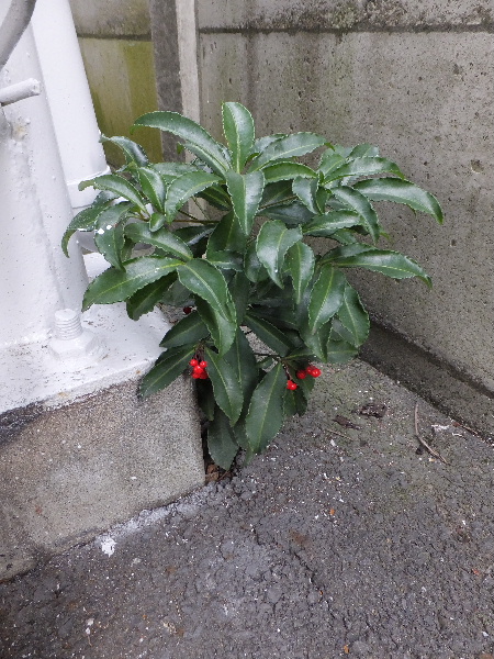 ・・・万両だと思うんだけど、なんでここ? アスファルト舗装の割れ目に生えてますが、このままにしておいてくれるんだろうか???